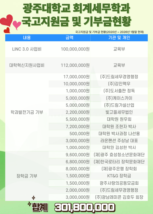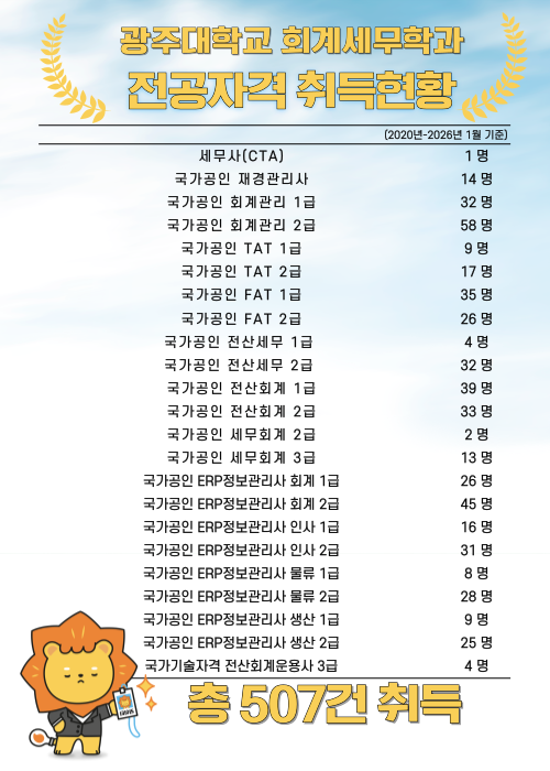 회계세무학과 김나연·박혜진 학생 ‘한국공인회계사회 회장상’ 영예 광주대학교(총장 김동진) 회계세무학과 4학년 김나연·박혜진 학생이 한국공인회계사회 회장상 수상의 영예를 안았다. 한국공인회계사회는 매년 전국 회계·세무 전공분야 학업성취 우수자를 표창하고 있으며, 광주대 회계세무학과는 지난해에도 오소정, 이다은 동문이 회장상을 받는 등 지역 최고 회계·세무 전문학과로 명성을 높이고 있다. 회계세무학과는 이번 수상 외에도 지난해 12월 이혜연, 김채연(이상 4학년) 학생이 전국 회계·세무 분야 전공 학생 가운데 자격 취득 우수자에게 수여하는 한국세무사회 회장상을 받은 바 있다. 광주대학교 회계세무학과는 인공지능 ERP, 재무 빅데이터분석 등 전문적이고 체계화된 교육과정을 운영하고 있으며 공인회계사, 세무사, 경영지도사 준비반, 회계 및 세무직 공무원 준비반을 운영하며 전공 자격증 취득도 적극적으로 지원하고 있다. 또한 광주대학교의 새로운 핵심가치인 기업가정신 구현을 위해 회계・세무・법률 관련 정부위탁 교육사업, 국가공인 자격시험 고사장 유치, 교육청 연계 청소년 아카데미 프로그램, 가족기업 경영지도 사업, 중소벤처기업부 계약학과 운영 등 다양한 사업을 수행하기 위한 회계세무 통합비즈니스센터 ‘GU-ATIS(Accounting Tax Integrated Square)’를 운영하고 있다.