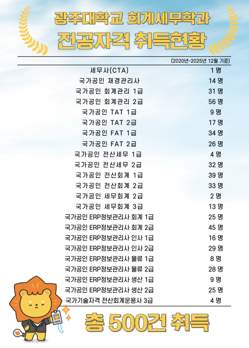 회계세무학과 김나연·박혜진 학생 ‘한국공인회계사회 회장상’ 영예 광주대학교(총장 김동진) 회계세무학과 4학년 김나연·박혜진 학생이 한국공인회계사회 회장상 수상의 영예를 안았다. 한국공인회계사회는 매년 전국 회계·세무 전공분야 학업성취 우수자를 표창하고 있으며, 광주대 회계세무학과는 지난해에도 오소정, 이다은 동문이 회장상을 받는 등 지역 최고 회계·세무 전문학과로 명성을 높이고 있다. 회계세무학과는 이번 수상 외에도 지난해 12월 이혜연, 김채연(이상 4학년) 학생이 전국 회계·세무 분야 전공 학생 가운데 자격 취득 우수자에게 수여하는 한국세무사회 회장상을 받은 바 있다. 광주대학교 회계세무학과는 인공지능 ERP, 재무 빅데이터분석 등 전문적이고 체계화된 교육과정을 운영하고 있으며 공인회계사, 세무사, 경영지도사 준비반, 회계 및 세무직 공무원 준비반을 운영하며 전공 자격증 취득도 적극적으로 지원하고 있다. 또한 광주대학교의 새로운 핵심가치인 기업가정신 구현을 위해 회계・세무・법률 관련 정부위탁 교육사업, 국가공인 자격시험 고사장 유치, 교육청 연계 청소년 아카데미 프로그램, 가족기업 경영지도 사업, 중소벤처기업부 계약학과 운영 등 다양한 사업을 수행하기 위한 회계세무 통합비즈니스센터 ‘GU-ATIS(Accounting Tax Integrated Square)’를 운영하고 있다.